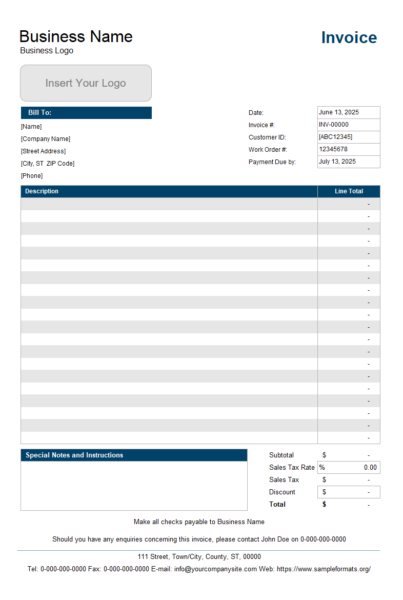 The sample service invoice format is necessary for the service provider to prepare the service invoice for the clients. The act of having this invoice is beneficial for both parties as it is an imperative part of the professional documentation system and practice. Nevertheless, it enables the management of the business to maintain a proper record of their business transactions. Moreover, the service invoice prevents the client from any sort of confusion they have, as it provides them with a clear-cut view of what costs what. Another purpose of having an invoice is to track payment status or calculate the total earnings of a business in a financial year, which will eventually assist in assessing tax. As it’s a document of great importance and is linked with the matter of finance, you should be very careful while preparing an invoice.